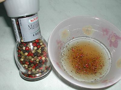 В уксусе растворить соль. Положить молотый перец (желательно брать смесь из 4-х перцев - черного, белого, зеленого, розового). Влить растительное масло и тщательно размешать.