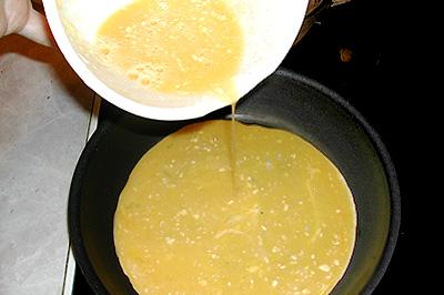 Сковороду поставить на средний огонь, слегка смазать маслом и вылить половину яичной массы. Когда нижняя сторона обжарится, блинчик перевернуть.