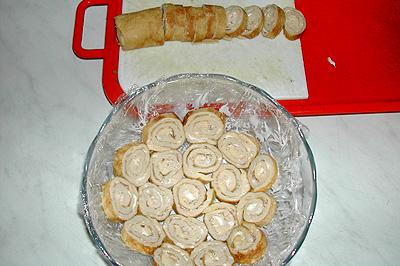 Яичные рулеты порезать на дольки толщиной 0,7~1см.