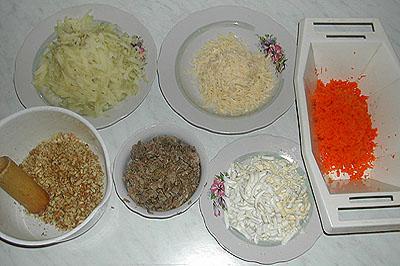 250~300г вареного мяса, 3 крупные вареные картофелины, 3 вареных яйца, 150г сырой моркови, 1 стакан грецких орехов, 130~150г сыра, 1 гранат, зеленый горошек, майонез
