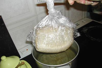 Сыр положить в крепкий полиэтиленовый пакет. Выпустить воздух и завязать. Держать в кипящей воде до тех пор, как сыр примет вид бесформенного мягкого кома (10~15 мин).