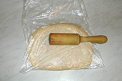 Пакет развязать и прямо в нем раскатать сыр в пласт толщиной 0,5~0,7мм.