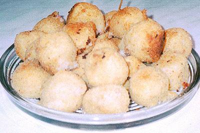 Шарики обвалять в муке, обмакнуть в яйцо и снова обвалять в панировочных сухарях. Можно сделать двойную панировку - еще раз обмакнуть в яйцо, а затем в сухари.