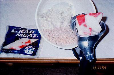 Смешать крабовое мясо с булочным тестом, посолить и поперчить.