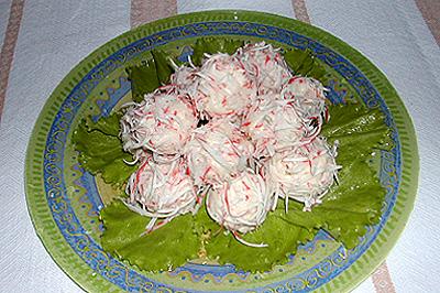 Ну а если Вы всё-таки решитесь повторить мой опыт с лже-крабовым мясом, то попробуйте сначала сделать из 1/2~1/3 состава продуктов.