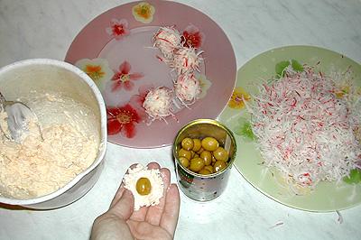 Небольшое количество сырной массы (примерно 1 ч ложку) размять в лепешку, положить на нее оливку (или маслину) и скатать в шарик. Если оливки не фаршированные, то внутрь при желании можно положить кусочек грецкого ореха.