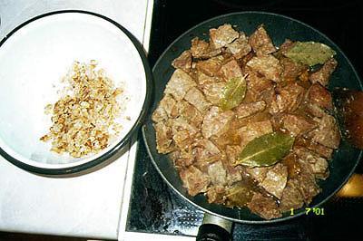 Мясо нарезать маленькими кубиками, величиной с горошину.