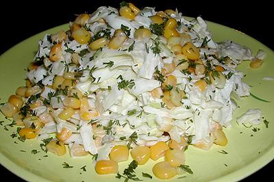 Смешать капусту, курицу, белки, кукурузу и смесь желтков с майонезом.