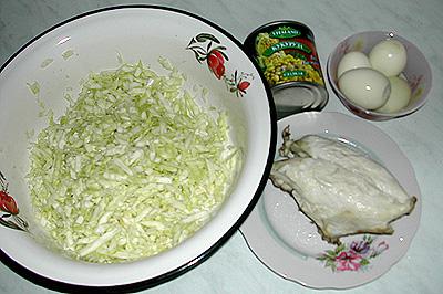 ~500г свежей капусты, 1 куриная грудка, 0,5~1 банка кукурузы, 4 вареных яйца, майонез, соль, перец