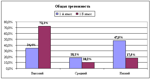 Так высокий уровень общей школьной тревожности в 1Б классе отмечается у 72,3%, в 1А этот показатель существенно ниже и составляет 34,4%. Высокий уровень тревожности препятствует ясности мысли, эффективности общения, предприимчивости, создает трудности при знакомстве с новыми людьми. (Диаграмма 2)