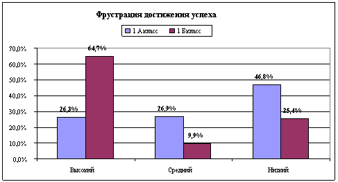 Средний уровень фрустрации достижения успеха в 1А составляет 26,9%, а в 1Б - 9,9% - этот показатель свидетельствует о том, что данная часть выборки попадает в ситуации неуспеха эпизодически.