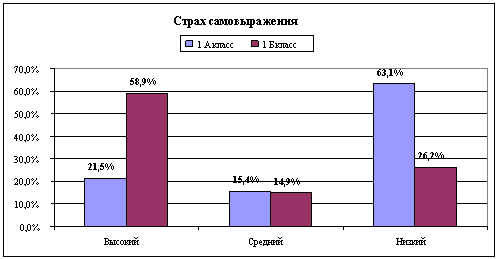 Чуть больше половины –58,9% учащихся 1Б и 21,5% учеников 1А класса испытывают страх самовыражения – показатель, обличающий негативные эмоциональные переживания ситуаций, сопряженных с необходимостью самораскрытия, предъявления себя другим, демонстрации своих возможностей. Достаточно позитивные показатели в 1А классе - больше половины - 63,1% учащихся не испытывают подобного страха, в 1Б этот показатель составляет 26,2 %. Это свидетельствует, что для данных учащихся атмосфера в классах выступает как благоприятная, комфортная среда, способствующая раскрепощенному, творческому, естественному поведению. (Диаграмма 5)