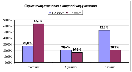 При этом в 1А классе 52,6% учащихся практически не испытывают страха неоправданных ожиданий окружающих в отличие от учеников 1Б класса, в котором этот показатель значительно ниже 20,3%. Это свидетельствует о том, что для данных респондентов большую ценность представляет собственное мнение о себе самом, своей учебе, поступках и т. д. нежели мнение окружающих.