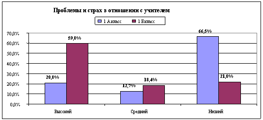 Как отмечают учащиеся чувство страх при взаимодействии с учителями в школе испытывают в 1А - 20,8%, а в 1Б - 59,8% данные результаты указывают на общий негативный фон отношений с взрослыми в школе, снижающий успешность обучения ребенка.