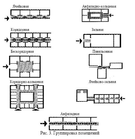 Известные возможные сочетания пространств внутри здания сводятся к шести основным схемам: ячейковой, коридорной, анфиладной, зальной, павильонной и смешанной или комбинированной (рис. 3.3).