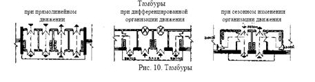 Тамбур – часть помещения между наружной и внутренней дверями или небольшая пристройка к зданию перед дверями для защиты от ветра, холода и жары и т. п. входные тамбуры – это воздушно-тепловые шлюзы у входа в здание (рис. 10).
