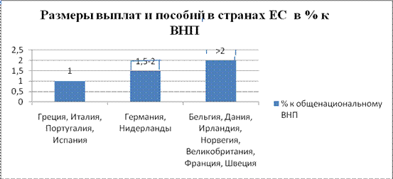 Рисунок 3- Размеры выплат и пособий в странах ЕС в % к ВНП (единиц национальной валюты в текущих ценах)