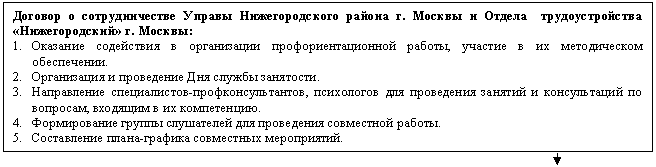 - заключение договоров с предприятиями и организациями города на трудоустройство инвалидов, зарегистрированных в органах службы занятости в качестве безработных граждан, предусматривающие выплату материальной поддержки (сроком до 2-х месяцев) трудоустроенным инвалидам за счет бюджета города Москвы в период испытательного срока;