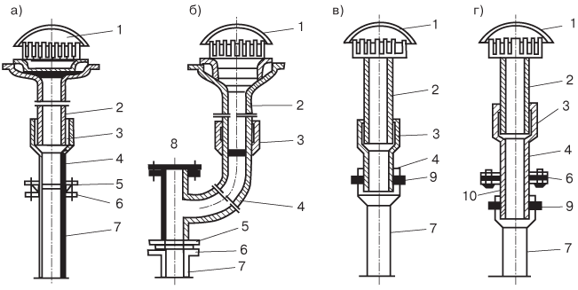 | Рисунок 1. Варианты узлов соединения водосточных стояков из пластмассовых труб с металлическими водосточными воронками 1 - водосточная воронка; 2 - сливной патрубок воронки; 3 - заделка канатом и цементом; 4 - стальная переходная деталь; 5 - резиновая прокладка; 6 - фланцевое соединение; 7 - отбортованный патрубок; 8 - прочистка; 9 - соединение на резиновом кольце стальной и пластмассовой труб; 10 - чугунный патрубок «фланец - гладкий конец»
