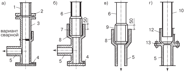 | Рисунок 2. Варианты узлов соединения водосточных стояков из пластмассовых труб с водосточными отводными трубопроводами из стальных труб 1 - пластмассовая труба с отбортовкой; 2 - фланцевое соединение; 3 - стальной патрубок с фланцем; 4 - прочистка; 5 - стальной трубопровод выпуска; б, 7 - пластмассовая труба с запрессованным стальным патрубком; 8 - заделка канатом и цементом; 9 - вклеенный патрубок из ПВХ; 10 - пластмассовая труба; 11 - чугунная деталь «фланец – раструб»; 12 - резиновое кольцо; 13 - фланцевое соединение