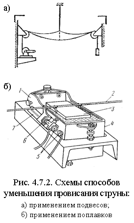 в крайних положениях прибора ее изображение совпадало с перекрестием сетки нитей зрительной трубы. При перемещении вдоль струны оптические приборы из-за ее провисания приходится фокусировать вновь, что вносит добавочные погрешности. Чтобы уменьшить стрелу провисания, иногда применяют поплавки, поддерживающие струну; более простым способом является применение подвесок (рис. 4.7.2).