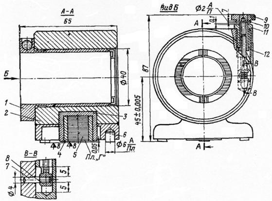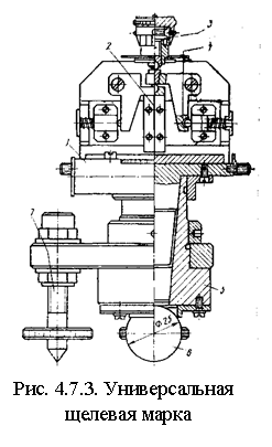 В корпус визира (рис. 4.7.10) устанавливается марка. Визир имеет магнит, позволяющий плотно стоять визиру на трех опорных штифтах на контролируемом месте. На визире, так же, как и на центроискателе, имеется приспособление для поворота марки с целью установки пузырька уровня в среднее положение. Места установки визира обкерниваются и нумеруются в соответствии с указаниями формуляра.