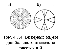 Для сохранения точности визирования на различных расстояниях применяют марки с четырьмя биссекторами переменной ширины, образующими крест ступенчатой формы. При этом каждый биссектор перекрывает диапазоны визирования соседних биссекторов (рис. 4.7.4, а). Применяют также марки с рисунком в виде V-образного креста (рис. 4.7.4, б). Другие марки для угловых измерений приведены в [1, 4, 129 – 131, 134, 137, 149, 188, 192, 228, 233, 236, 239, 243, 255, 256 и других изданиях].