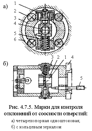 Марка для контроля отклонений от соосности глухих отверстий, обращенных друг к другу, снабжают кольцевым зеркалом 4, позволяющим получить автоколлимационное изображение сетки (рис. 4.7.5, б). У такой марки перемещение штока 2 с целевым знаком 1 по направляющим 3 осуществляют с помощью микрометрического винта 5.