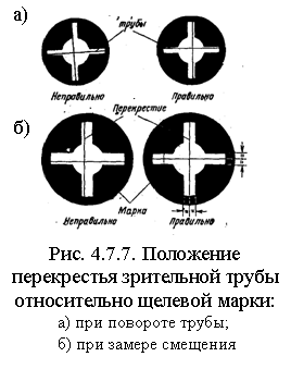 Установка перекрестия зрительной трубы по отношению к щелям марки выполняется вращением ее в раме вокруг продольной оси (рис. 4.7.7, а). При выполнении замера перекрестие зрительной трубы нужно располагать так, как указано на рис. 4.7.7, б.