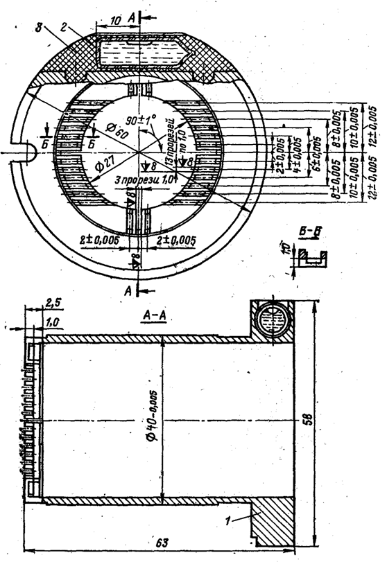 Каждая марка (рис. 4.7.8) имеет 3 вертикальных и 13 горизонтальных щелей. Расстояние между соседними щелями (2 ± 0,005 мм) определяется пределом измерения микротелескопа (±1 мм). Наличие щелей позволяет измерить вертикальные смещения центров расточек до ±13 мм, а горизонтальные смещения – до ±3 мм. В зависимости от расстояния до визируемой марки они применяются с разной шириной щелей: 0,5; 0,75 и 1 мм.