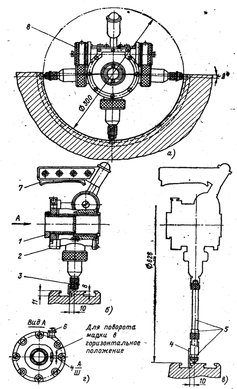 Для автоматической установки марки в центре расточек в корпусах подшипников, цилиндров турбин и диафрагм применяется центроискатель (рис. 4.7.9). Ножки прижимаются спиральными пружинами к конусу, расположенному в корпусе центроискателя. Конус позволяет уменьшить или увеличить длину ножек на одинаковую величину – до 25 мм. Для применения центр центроискателя в расточках разного диаметра на его ножки навертываются удлинители (рис. 4.7.9, в) стандартного микрометрического нутромера.