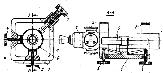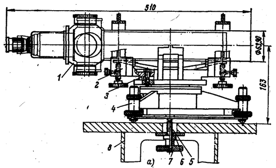 Зрительная труба устанавливается в кронштейне на горизонтальном разъеме цилиндров турбины или на полноповоротном штативе (рис. 4.7.11). С помощью установочных винтов производится перемещение трубы при ее выверке в горизонтальной плоскости и по оси валопровода турбины.