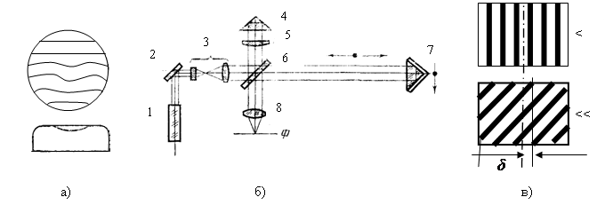 В простейших приборах на тщательно изготовленный эталонный образец накладывают выверяемую поверхность, получая между ними тонкую воздушную прослойку, дающую в отраженном свете четкую интерференционную картину (рис. 4.7.18, а). Измеряя микрометром величины наклона и прогиба или оценивая их на глаз в долях ширины, можно подсчитать в различных точках выверяемой поверхности ее отклонение от эталонной
