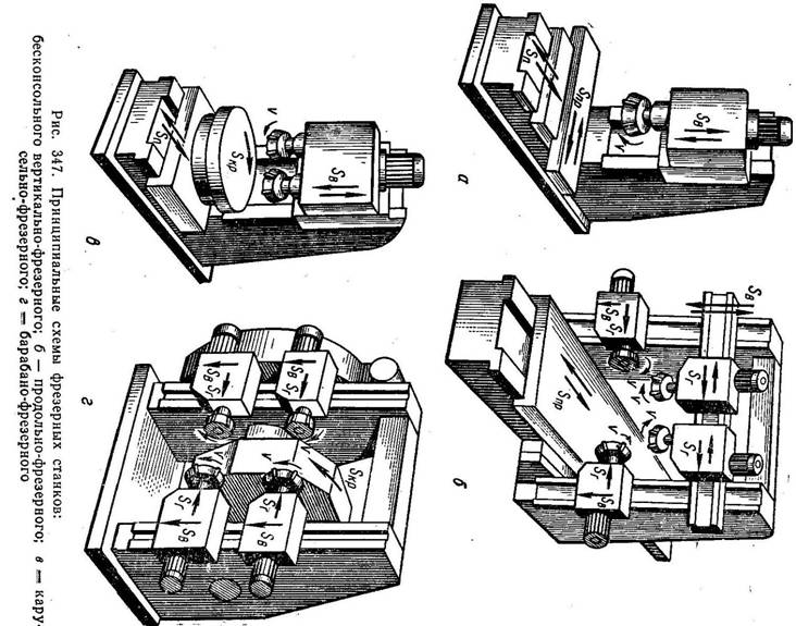 На рисунках показаны схемы карусельно-фрезерного и барабанно-фрезерного специальных станков. На этих станках торцовыми фрезами обрабатывают плоские поверхности заготовок в массовом и крупносерийном производстве.