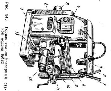 На горизонтальных направляющих консоли установлены поперечные салазки 11, поворотная плита 9, а в направляющих поворотной плиты продольный стол 8. Привод подачи размещен в консоли и состоит из электродвигаи коробки подач 13.