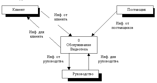 Итак, приступим к анализу предметной области. Из его описания следует, что в работе видеотеки участвуют следующие группы людей: клиенты, поставщики, руководство и работники Видеотеки. К внешним объектам можно отнести первые три группы пользователей. Начальная ДПД будет иметь звездообразный вид. В центре находится процесс 0-го уровня "Видеотека", соединенный потоками данных с внешними объектами.