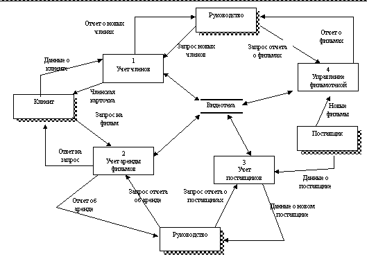 4. Информация от руководства включает: запросы отчетов о новых членах, о новых поставщиках, о новых фильмах; об аренде фильмов, о составе видеотеки, о поставщиках вообще.