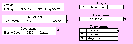 Каждому узлу соответствует своя структура записей. Например, в узле Отдел запись содержит поля Номер, Название, Фонд з\п.