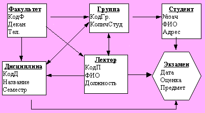 Пример. Рассмотрим ER-модель факультета (на рис. 7.3 показаны связи типа "является частью" и процесс сдачи экзаменов и чтения лекций).