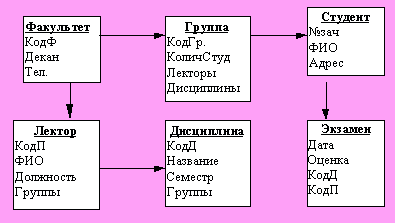 В качестве корня выбран узел “Факультет”, так как все дуги выходят из него. Обратите внимание, как изменился состав атрибутов в узлах дерева: добавлены внешние ключи вместо разорванных связей типа 1:М (например - в узле Экзамен). Вместо удаленных связей М : М добавлены векторные атрибуты "Лекторы" и "Дисциплины" в узле Группа; атрибут "Группы" в узле Лектор, атрибут "Группы" в узле Дисциплина. Налицо дублирование информации, которое можно уменьшить, но тогда усложнится обработка запросов к БД.