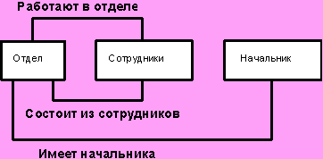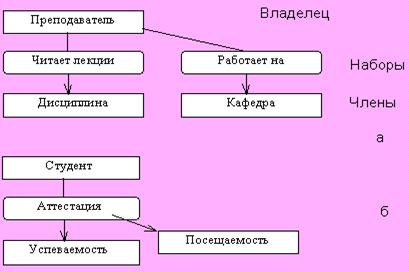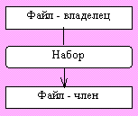 Рис. Графическое представление набора | Набор - это поименованное двухуровневое дерево, которое реализует связь между записями двух типов: владельцем набора и членом набора. Разрешаются только связи 1 : М или М : 1 , но связи M : N в явном виде не поддерживаются. |