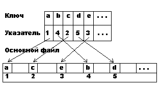 Основная идея состоит в следующем: в дополнение к основному файлу данных создается индексный файл, который содержит значения ключей и указатели на соответствующую запись. Индексный файл упорядочен по значению ключа. Обычно индексный файл меньше по размеру, чем основной, и скорость поиска в нем выше, так как он отсортирован.