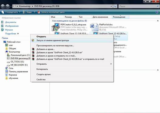 Для установки системы UniPrint - Клиент нужно запустить с компакт диска программу установки UniPrint-Client_12-3.91.97.0.drv. exe (ДЛЯ ОС WINDOWS VISTA или Windows 7 ИСПОЛЬЗОВАТЬ BiPrint-Client_12-4.1.23.0.exe, нажав на значке программы правой клавишей мыши, выбрать – «ЗАПУСТИТЬ ОТ ИМЕНИ АДМИНИСТРАТОРА»).