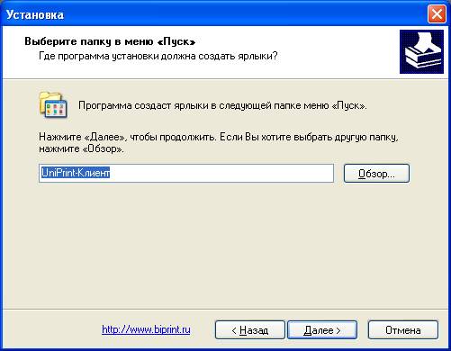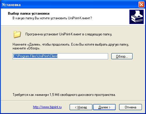 Каталог для установки - это каталог, в который будут помещены все компоненты UniPrint - Клиент. На данном шаге можно сменить этот каталог. Обычно нет необходимости изменять имя каталога, предлагаемое программой установки.