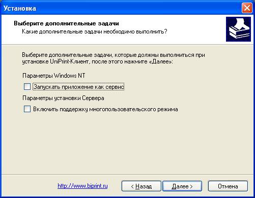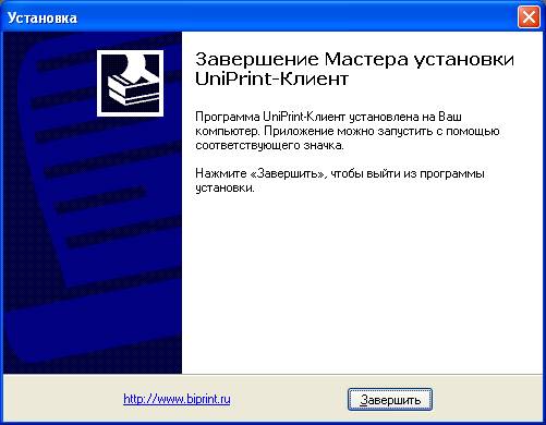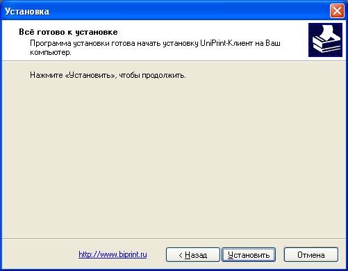 Программа последовательно выведет на экран ряд диалогов, в которых попросит ответить на несколько простых вопросов. После того, как получены ответы на все вопросы и нажата кнопка “Установить”, программа установит UniPrint - Клиент на компьютер в соответствии с полученными указаниями.