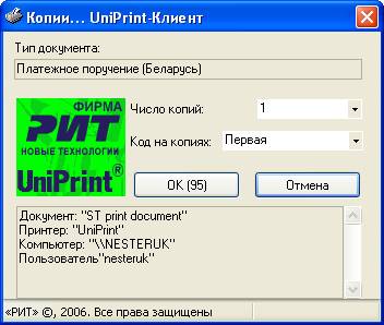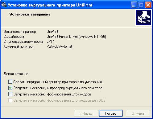 необходимо выбрать виртуальный принтер UniPrint (BiPrint), в остальных настройках никаких изменений не требуется. После нажатия кнопки «ОК» появится окно (возможно, оно останется свернутым на панели задач)