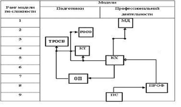 К моделям подготовки специалиста относятся образовательная программа (ОП), квалификационные требования (КТ), требования к образовательной среде и бакалавров подготовки (ТРОСБ) и государственный общеобязательный стандарт образования (ГОСО), а к моделям профессиональной деятельности - психограмма (ПС), профессиограмма (ПРОФ), квалификационная характеристика (КХ), модель деятельности (МД). В качестве базовых характеристик перечисленных моделей могут выступать указанные в таблице требования к личности специалиста и требования к его профессиональной деятельности. В сформированной системе моделей подготовки и профессиональной деятельности специалистов можно попытаться построить иерархию элементов по сложности. Для этого введем интегральный показатель, характеризующий сложность отдельной модели следующим образом Модели подготовки и профессиональной деятельности преподавателя высшей школы являются конкретизацией моделей специалиста. На разных квалификационно-должностных уровнях (КДУ) непрерывного образования педагога профессионального обучения присутствуют разные модели из приведенной системы моделей. К настоящему времени разработаны ГОСО на квалификационных уровнях бакалавра, специалиста и магистра по всему спектру направлений и специальностей (в том числе для педагогов); ТРОСБ для получения дополнительной специализации профессиограммы педагога профессионального обучения и квалификационные требования к ним. Большинство моделей будущего педагога на разных КДУ еще предстоит разработать. Структура учебного комплекса, сформированной согласно предложенной модели действующей в АИПА приведена в таблице 4.
