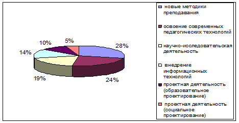 В результате ранжирования таблица 11 были определены приоритетные направления деятельности педагогов образовательного комплекса, которая включает: обновление содержания, структуры и форм образовательной деятельности (рисунок 7). Продуктивность учебно-воспитательного процесса обеспечивается посредством организации проектной деятельности (образовательного и социального проектирования), работу по освоению и апробации которых необходимо было усилить.