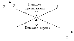 Если цена упадет ниже равновесной цены, то это приведет к образованию избыточного спроса (дефицита), побуждающего конкурирующих покупателей к предложению более высокой цены. Любая цена выше равновесной приводит к возникновению избыточного предложения (перепроизводства), побуждающего конкурирующих продавцов снижать цену. В точке равновесия и только в ней силы, склонные к осуществлению ценовых изменений, уравновешивают друг друга.