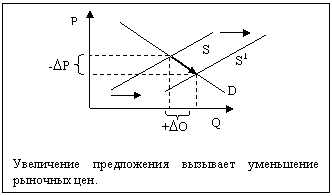 на рынке возрастает величина предложения, с уменьшением цен убывает величина предложения).